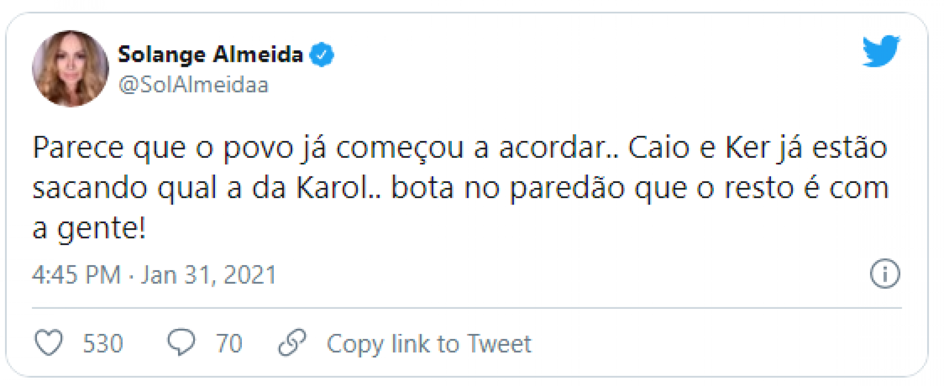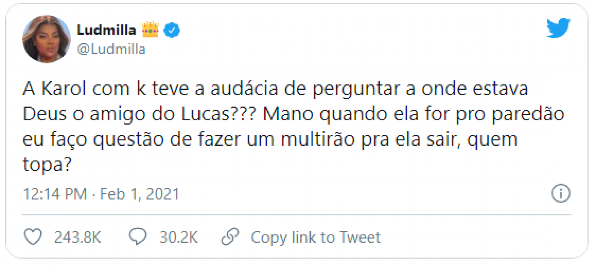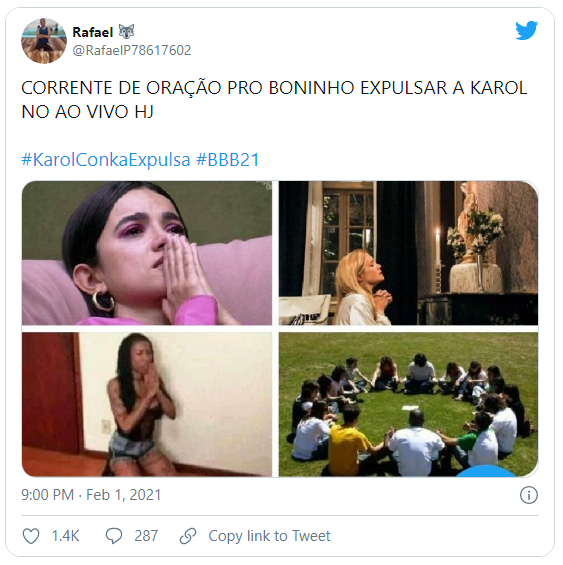 Anteriormente, Karol foi alvo de reações negativas nas redes sociais e acusada de xenofobia após fazer comentários pejorativos sobre o jeito da paraibana Juliette. Neste domingo, 31, Karol também foi acusada de intolerância religiosa ao sugerir para Lumena e Fiuk que a casa deveria orar o Pai Nosso quando Lucas estivesse falando.