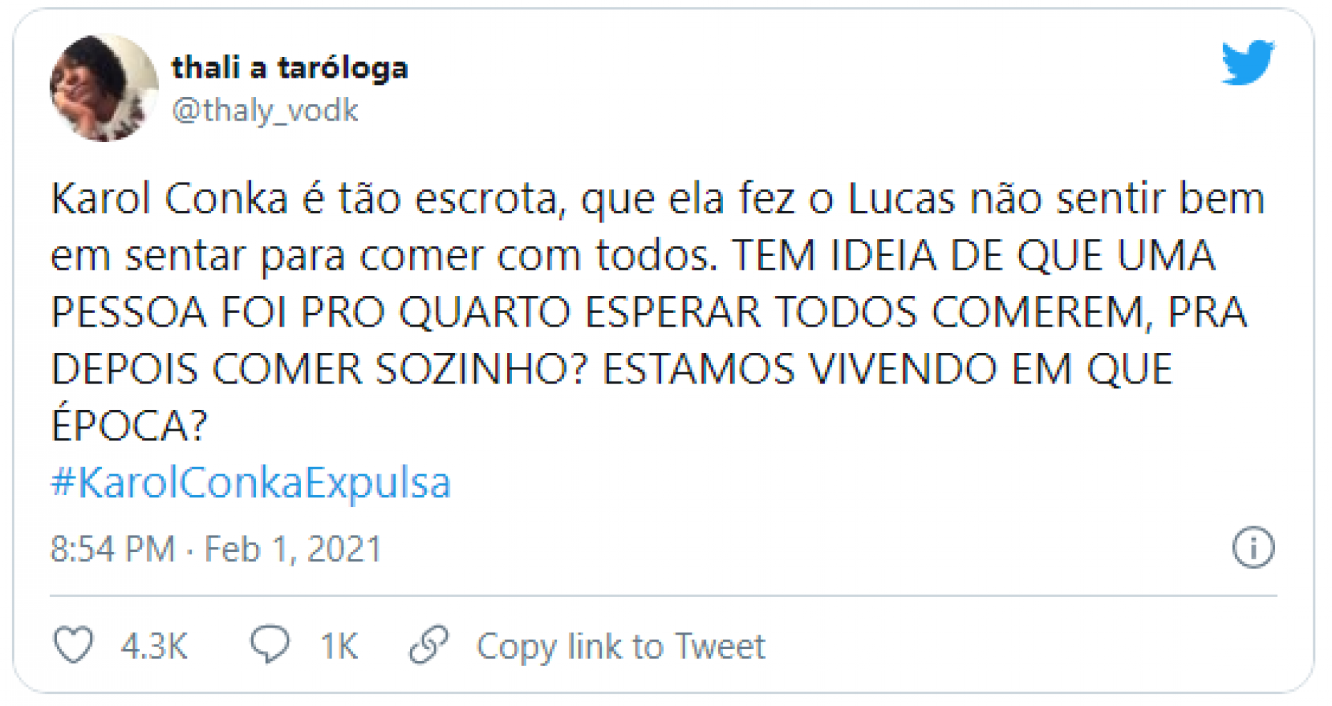 Há menos de duas semanas no ar, o “BBB21” tem proporcionado situações inesperadas. Uma delas é o comportamento de Karol Conká na casa e em relação ao brother Lucas Penteado, o que levou internautas a criar a hashtag #KarolConkaExpulsa, uma das mais comentadas no Twitter nesta segunda-feira, 1º.