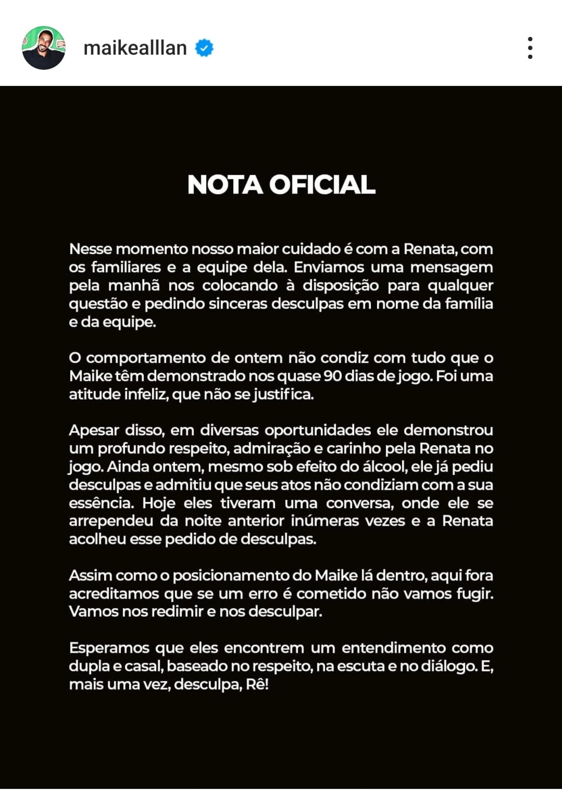 Também acrescentaram que a ação do brother não condiz com o que ele “vem demonstrando nos quase 90 dias de jogo”. “E, mais uma vez, desculpa, Rê”, finaliza a nota.