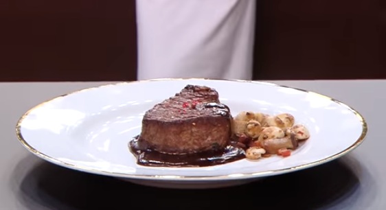 Os participantes tiveram que preparar um prato de carne com chocolate. Maria Antonia preparou um delicioso filet com molho de chocolate e vinho.