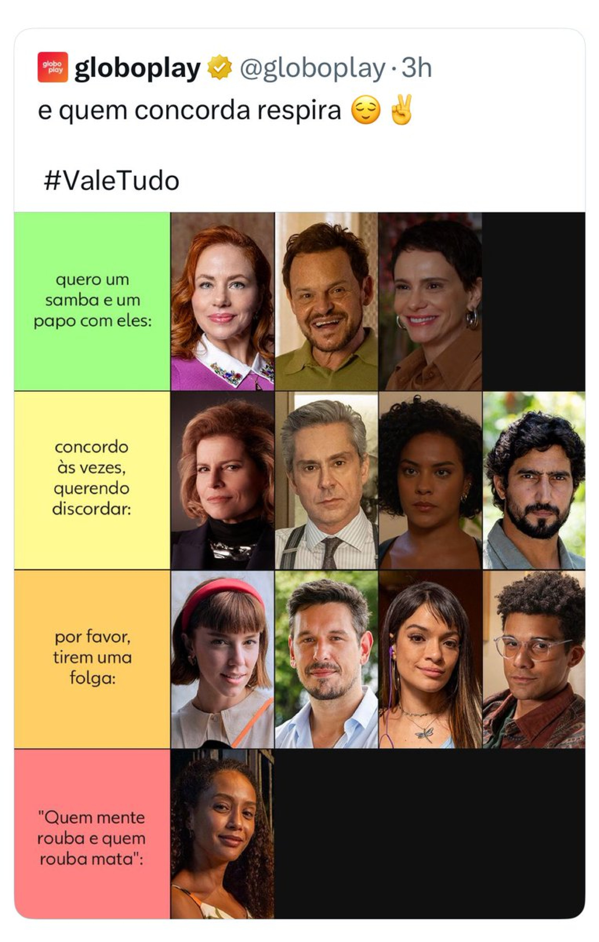 Perfil da Globoplay compartilha tabela que faz críticas às personagens de "Vale Tudo", com destaque à Raquel, personagem de Taís Araújo