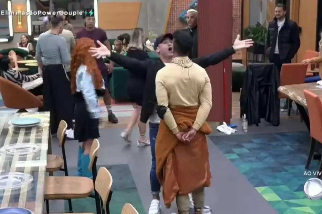 A briga começou com o festejo do casal Matheus e Brenda por terem retornado da sua segunda berlinda no jogo. Ao entrar na casa, os dois pularam e debocharam dos companheiros de confinamento, exclamando: “Chupa, chupa! Vão ter que aturar a gente [na casa]”.