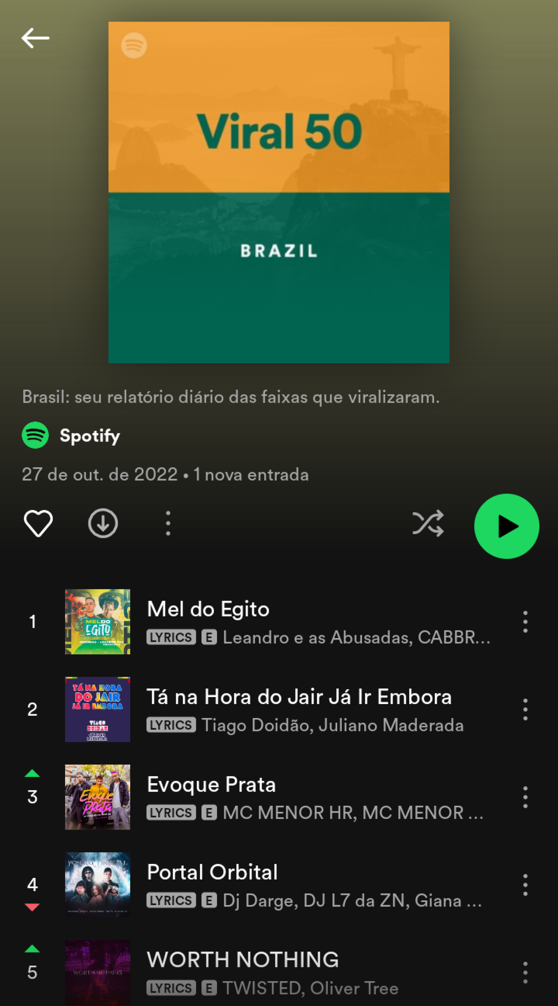 "Tá na hora do Jair já ir embora" é o título da música que viralizou no Spotify, serviço de streaming de áudio, nesta quinta-feira, 27. A canção, que é contrária ao atual presidente e candidato à reeleição, Jair Bolsonaro (PL), alcançou o segundo lugar das 50 músicas virais do Brasil.