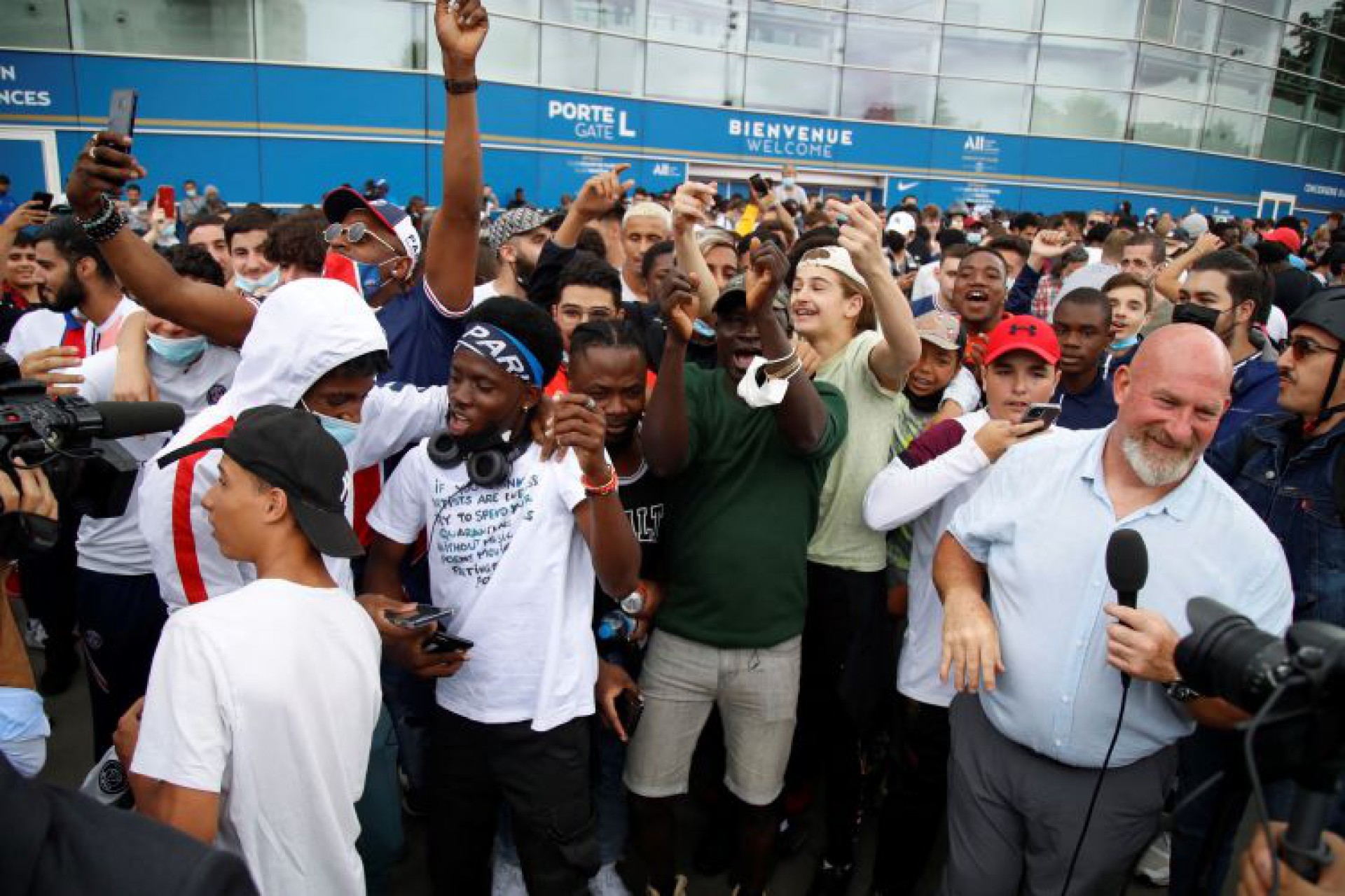 No aeroporto Le Bourget, localizado na capital da França, o jogador acenou para fãs que aguardavam ansiosamente a chegada do craque