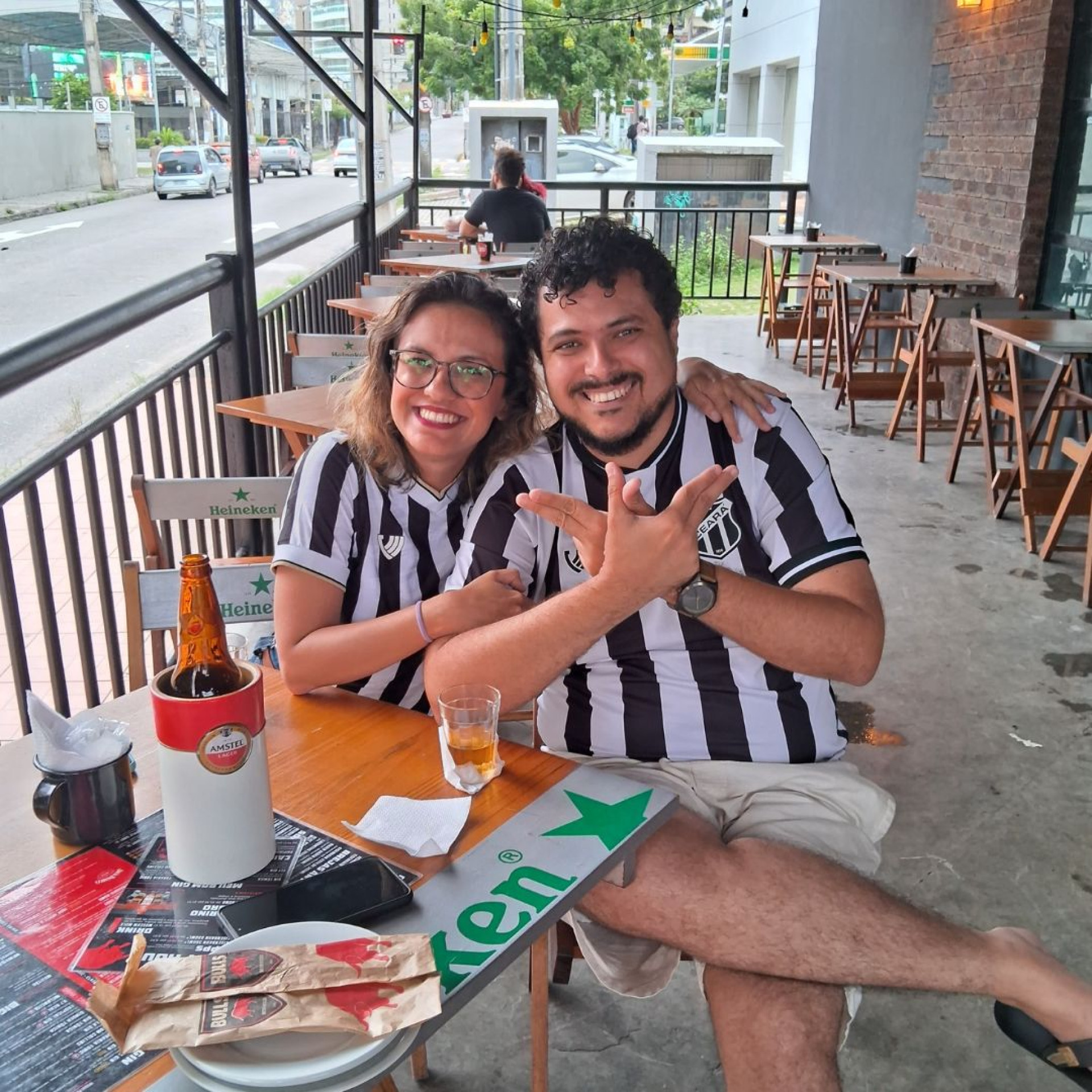 Juntos há quase 5 anos, o casal Beatriz e Rafael costuma assistir aos jogos do Ceará juntos — seja no estádio ou não. Segundo ele, o casal encontrou no bar um refúgio para tentar simular o clima do Castelão. “Às vezes você está em casa e fica aquele negócio só você e a televisão, não tem um agito”, explicou Rafael.