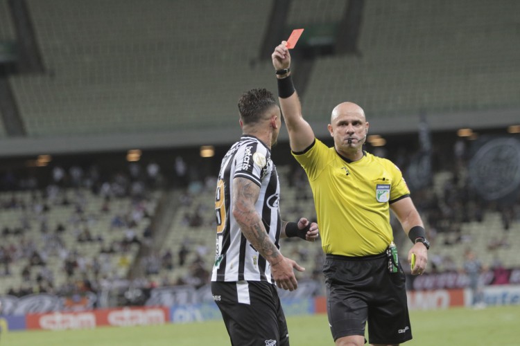 “Após receber o primeiro cartão amarelo por conduta antidesportiva, veio em minha direção contestando e reclamando em voz alta, acintosamente, discordando do meu ato disciplinar anterior, encostando, de forma ríspida, seu peito ao meu e aproximando seu rosto de forma afrontosa”, relatou.