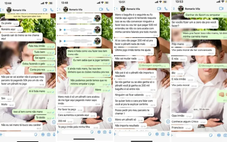 Um dos apostadores, identificado como VY, entrou em contato com Domingos, jogador do time goiano. Mensagens trocadas em 4 de novembro, revelam acordo para o meia cometer a penalidade no lugar de Romário. Nas conversas, ele afirma que fará e chega até a enviar dados para a transferência bancária.