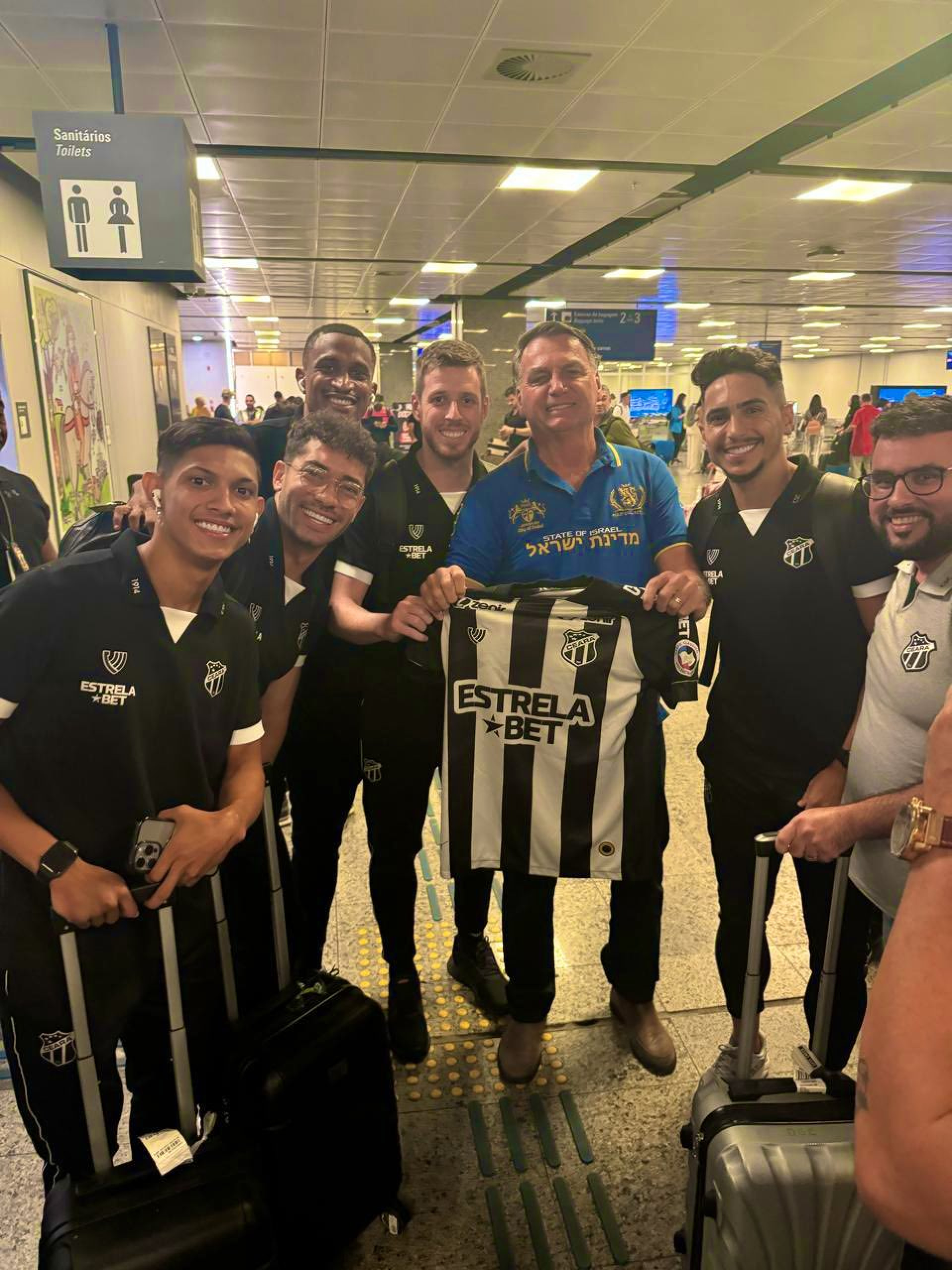 Cinco jogadores do Ceará aproveitaram o encontro para tirar uma foto com Bolsonaro: Saulo Mineiro, Erick Pulga, Aylon, Raí Ramos e Jean Irmer. Na imagem, cujo registro aconteceu no local de retirada das malas do Aeroporto, o ex-presidente aparece segurando uma camisa do clube alvinegro enquanto é rodeado pelos atletas citados.