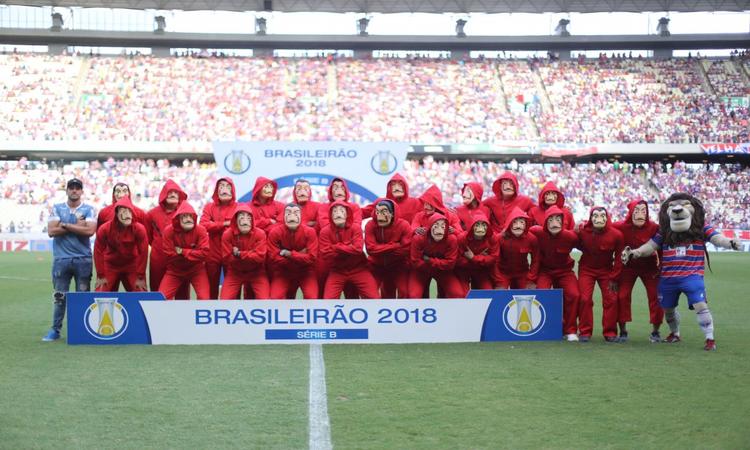 [FOTO1] Durante o pré-jogo contra o Juventude nessa quinta-feira (15), jogadores do Fortaleza entraram em campo vestidos com trajes de “La Casa de Papel”, série da Netflix, em ação de marketing do time. Em clima de festa pelo acesso à série A, o time posou para as fotos de pôster com máscaras e macacões vermelhos.