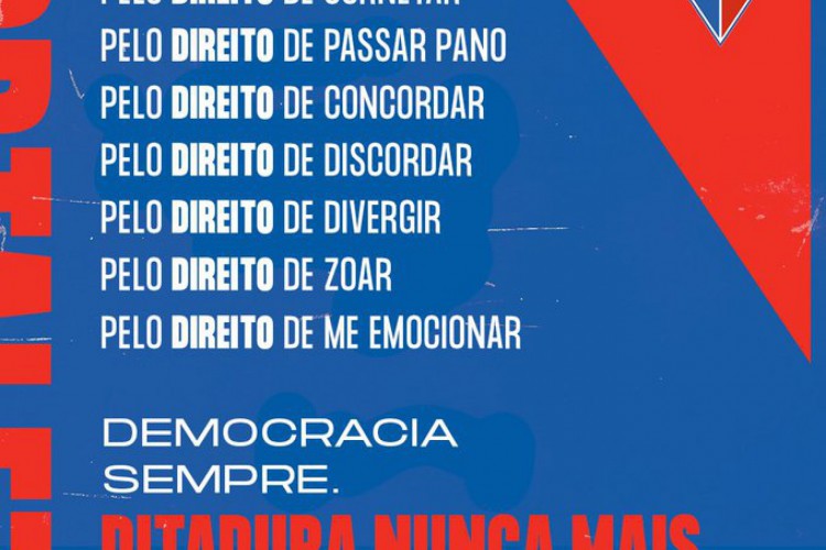 "Sócio vota e blogs participam das entrevistas. Assim se faz um clube democrático". Foi com essa frase que o Fortaleza se manifestou por meio das redes sociais em prol da democracia nesta quarta-feira, 31, dia que marca o aniversário de 57 anos do início da ditadura militar.