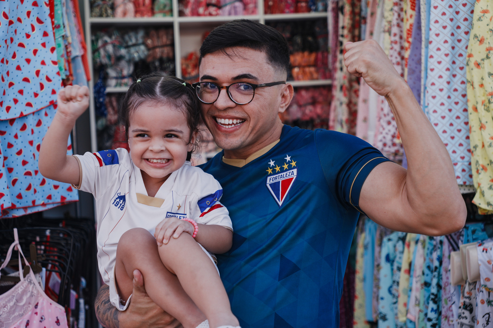 Depois das brincadeiras pela manhã, Paulo leva sua filha para a escola no turno da tarde. Ao voltar, trilha seu caminho para a avenida Beira Mar, onde trabalha vendendo roupas para dormir. O pai do ilustre torcedor tem um box no local, bem no final da feirinha.