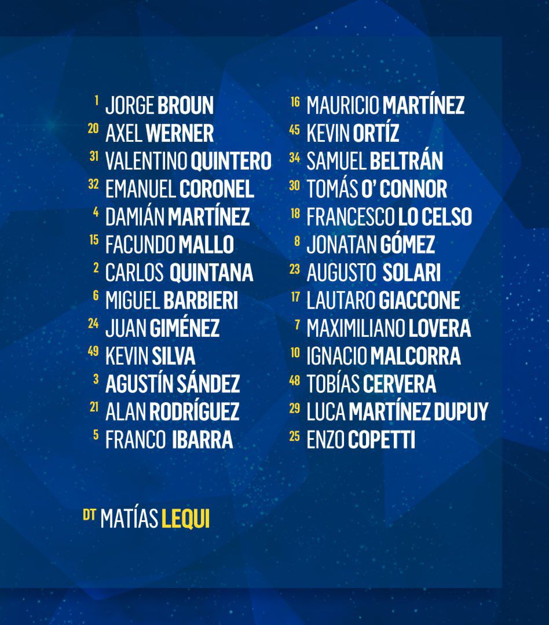 4-2-3-1: Broun; Coronel, Mallo, Quintana e Sández; Martínez e Ibarra; Gómez, Augusto Solari (Lovera) e Giaccone; Enzo Copetti (Cervera). Téc: Matias Lequi.