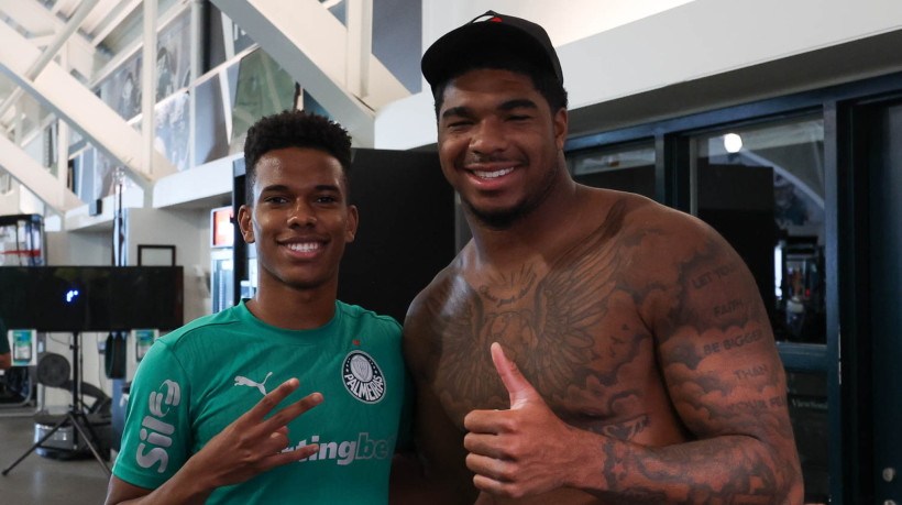 Após o treino desta terça-feira, a delegação alviverde dividiu as instalações com atletas do Eagles. Jihaad Campbell, linebacker do Philadelphia Eagles, por exemplo, posou para foto com Estêvão e Raphael Veiga.