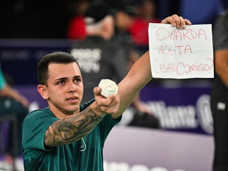 Triste por ser derrotado por 2 sets a 0 pelo francês Lucas Mazur, o atleta brasileiro de badminton, Rogério Júnior, não se deixou abalar pela eliminação nas Paralimpíadas de Paris e, após o fim do jogo, ele se dirigiu à torcida e pediu sua namorada, e agora noiva, Edwarda, em casamento.