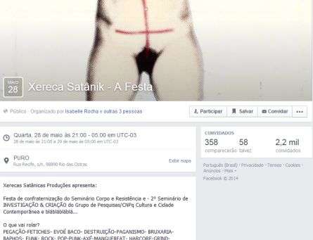 No facebook, 354 pessoas confirmaram presença para o “Xereca Satânik- A festa”, que conforme a descrição, é uma “Festa de Confraternização do Seminário Corpo e Resistência e 2º Seminário de Investigação e Criação do Grupo de Pesquisas Cultura e Cidade”. AS atividades do eventos também são descritas, incluindo “Pegação, fetiches, evoébaco, destruição, paganismo, bruxaria, baphos, funk, rock, travessuras e travestir, fofuras, paz e amor”, dentre outros.