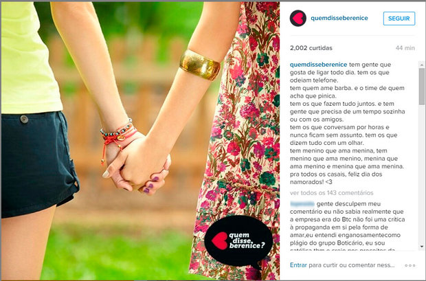 No perfil do instagram, a loja 'Quem Disse, Berenice?' divulgou nesta sexta-feira, 12, uma foto de duas mulheres de mãos dadas. Além disso, como legenda da fotografia, a marca prestou uma homenagem e desejou feliz dia dos namorados.