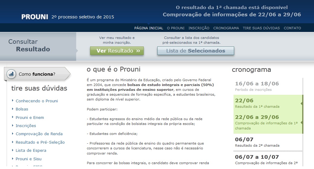 No dia 6 de julho será divulgado o resultado da segunda chamada. Aqueles que não forem selecionados poderão participar da lista de espera nos dias 17 e 20 de julho. Segundo o MEC, ao todo, foram ofertados 68.971 bolsas integrais e 47.033 parciais.