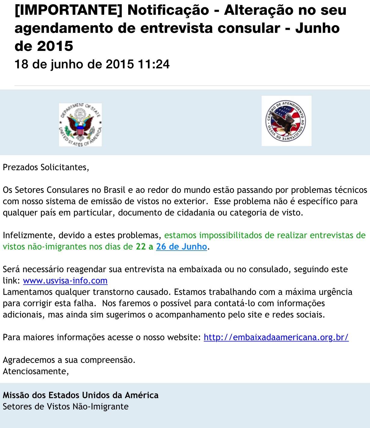 "O consulado me comunicou via email dizendo que a data da entrevista que eu tinha marcado, 26 de junho, tinha sido cancelada e que eu entrasse no site para remarcar. Graças a deus eu ia pra Recife de carro, então não comprei passagens aéreas", afirmou Gustavo.