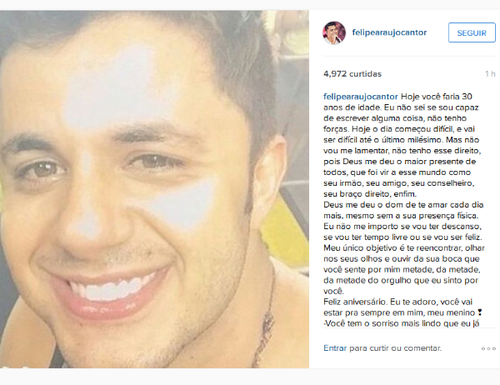Felipe Araújo, irmão de Cristiano Araújo, que morreu em um acidente de carro há sete meses, em Goiás, fez uma homenagem ao sertanejo nas redes sociais. Cristiano completaria 30 anos neste domingo, 24, se estivesse vivo. Felipe relatou que o dia começou difícil.