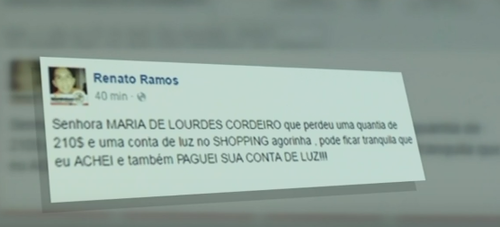 “Senhora Maria de Lourdes Cordeiro, que perdeu uma quantia de R$ 210 e uma conta de luz no shopping agorinha, pode ficar tranquila que eu achei e também paguei sua conta de luz”, publicou Renato em seu Facebook.