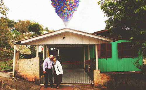 A fotógrafa Larissa Lamp, de 19 anos, por meses procurou um casal de idosos que topasse fazer um ensaio inspirado na animação "Up-Altas Aventuras" (Pixar, 2009), da qual é fã. O casal Claimar e Maria resolveu acatar a ideia da filha e aproveitou para presentear os bisavós Rosina, de 86 anos, e Claudino, de 83 anos, que estão celebrando bodas de casamento, com o ensaio.
