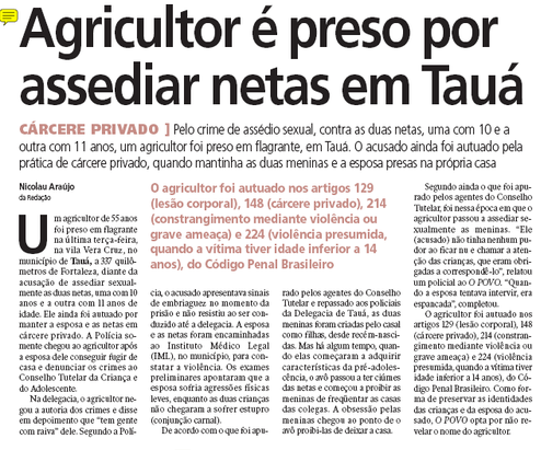 [FOTO1] Tauá. Em setembro de 2016, um agricultor, de 55 anos, foi preso em flagrante por abusar das netas, com então 10 e 11 anos, e mantê-las em cárcere privado juntamente com sua esposa. As meninas foram cridas pelo casal desde o nascimento. À medida que elas foram crescendo, o criminoso desenvolveu um ciúme doentio pelas netas, proibindo-as de sair. Abusos sexuais também eram cometidos e quando a esposa tentava intervir, elas eram espancadas.