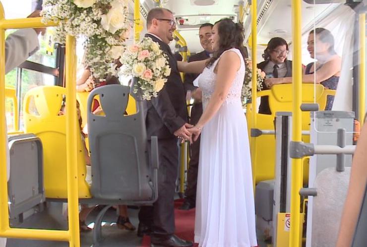 Noivos fazem casamento em ônibus dentro do qual se conheceram