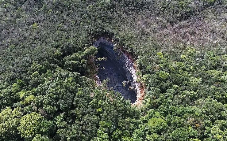 A dupla não imaginava, no entanto, que esbarraria com uma cavidade, digamos, bem maior do que aquelas em que os tatus costumam se esconder. Buraco, não, cratera com mais de 40 metros de profundidade, aberta em meio ao resquício de mata atlântica que beira a costa do povoado.