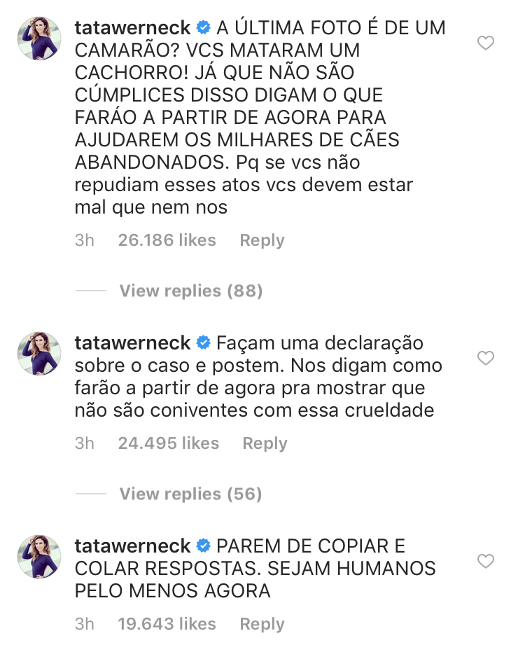 "Não entro mais nesse mercado", "Parem de dar respostas prontas para um ato de crueldade. Façam alguma coisa" e "Como vão fazer agora para ajudar os animais que, com fome, aparecem no mercado em busca de comida? Vão matar?" estavam entre os comentários deixados por Tatá Werneck em publicação no perfil do grupo no Instagram. "E aí? Dei duas horas pra vocês e não conseguiram se pronunciar ainda?", indagou a apresentadora do Lady Night em outro comentário horas depois. Ela ainda utilizou seu próprio perfil para demonstrar revolta com a situação.