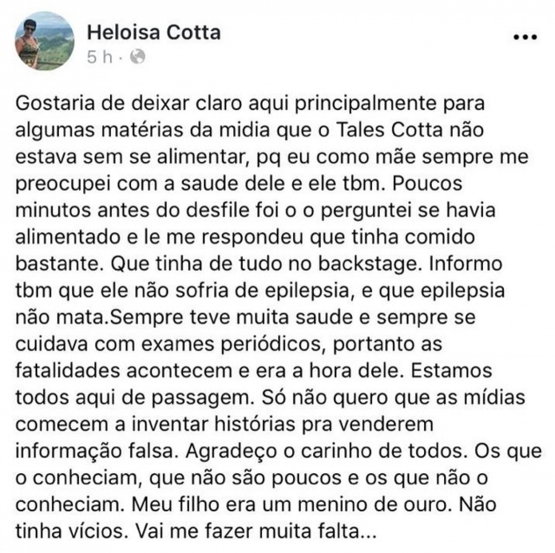 A mãe de Tales, Heloisa Cotta, se manifestou nas redes sociais. Heloisa reforça que o filho não tinha problemas de saúde ou transtornos alimentares. “Sempre teve muita saúde e sempre se cuidava com exames periódicos, portanto as fatalidades acontecem e era a hora dele”, escreveu ela.