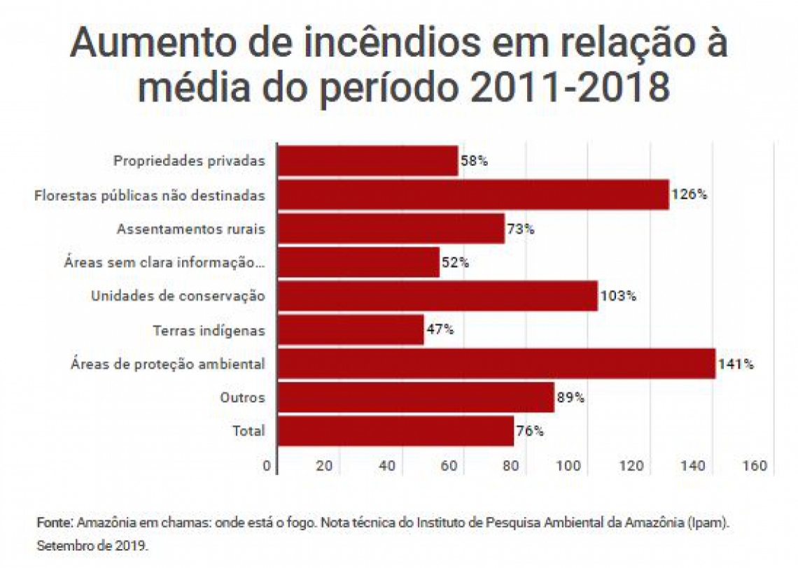 A mesma nota técnica do Ipam mostra que, quando 2019 é comparado com a média de focos de fogo entre janeiro e agosto de 2011 a 2018, as queimadas nas áreas de proteção ambiental aumentaram em 141%. Os incêndios em unidades de conservação e em florestas públicas não destinadas também mais que duplicaram.