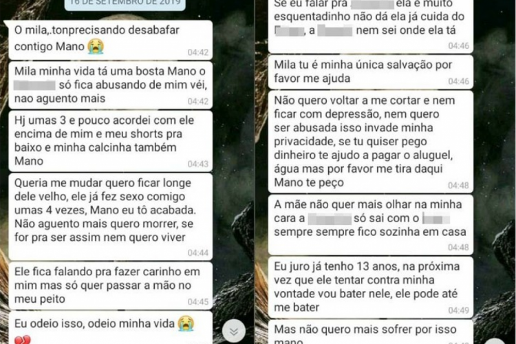 "Quero me mudar; quero ficar longe dele, velho. Ele já fez sexo comigo umas quatro vezes. Mano, eu tô acabada. Não aguento mais. Quero morrer", escreveu a menina à irmã. "Ele fica falando para fazer carinho em mim, mas só quer passar a mão no meu peito. Eu odeio isso; odeio minha vida", completou.