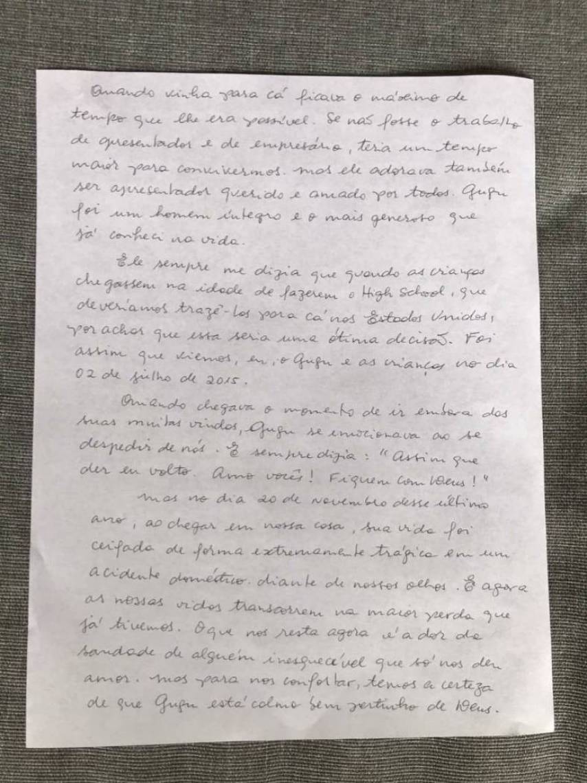 "Gugu foi um querido e zeloso pai e marido. Foi meu companheiro nos momentos felizes na criação e educação dos filhos", continua. Segundo a carta, Rose se conforta em "ter a certeza que Gugu está calmo e bem pertinho de Deus".