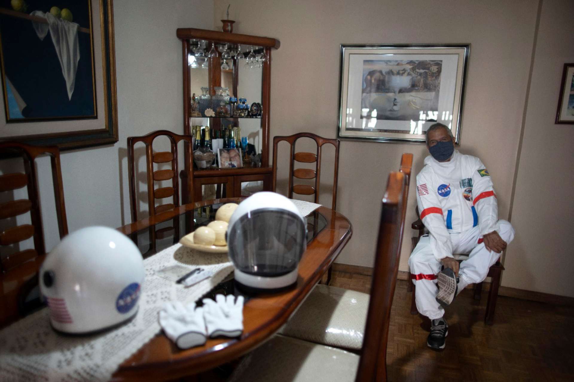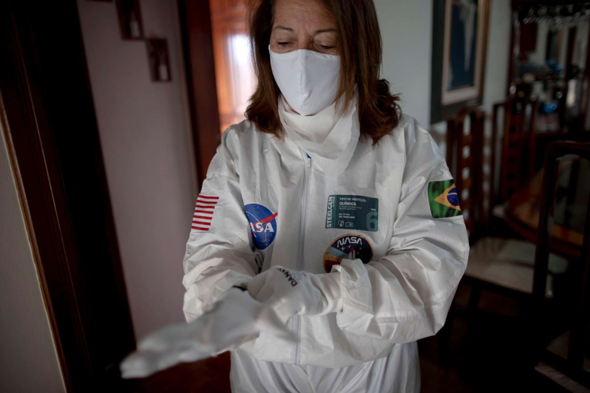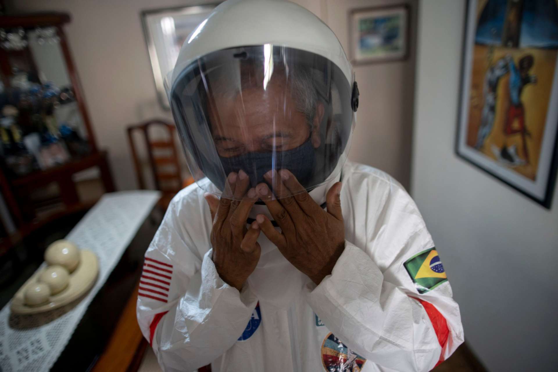 O contador Tércio Galdino, 66, decidiu vestir uma roupa de astronauta, que ele mesmo fez, para caminhar na rua protegido ao lado da esposa, a corretora Alicéia, 65. Tércio contou ao portal G1 que tudo foi improvisado: o capacete foi feito usando balão de festa e massa acrílica, já o macacão é o mesmo usados por enfermeiros. De bônus, foram colados adesivos para deixar o look mais parecido.