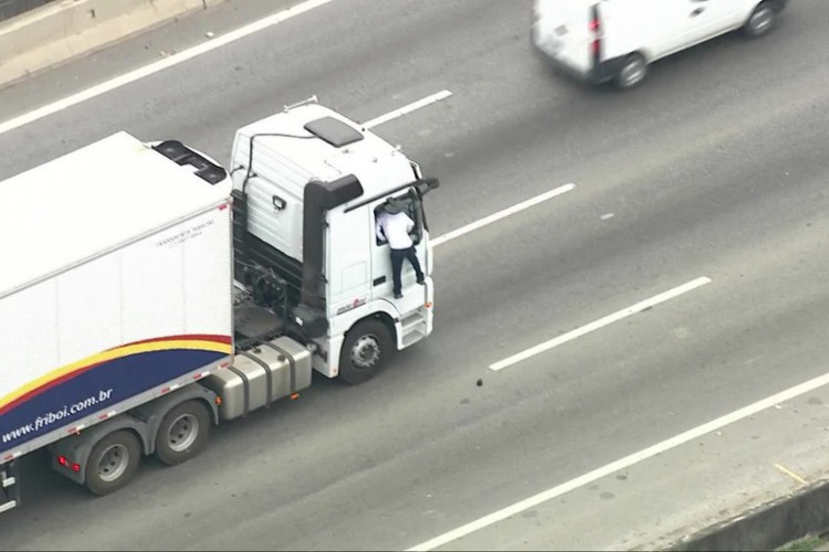 Homem é flagrado pendurado na lateral de um caminhão, após pular a janela do veículo em tentativa de roubar carga, no Rio de Janeiro. As imagens foram capturadas pela equipe do Globocop, da TV Globo, na manhã desta segunda-feira, 31. Segundo a reportagem do G1, o caso ocorreu na Rodovia Washington Luís (BR-040), na Baixada Fluminense, altura de Duque de Caxias.