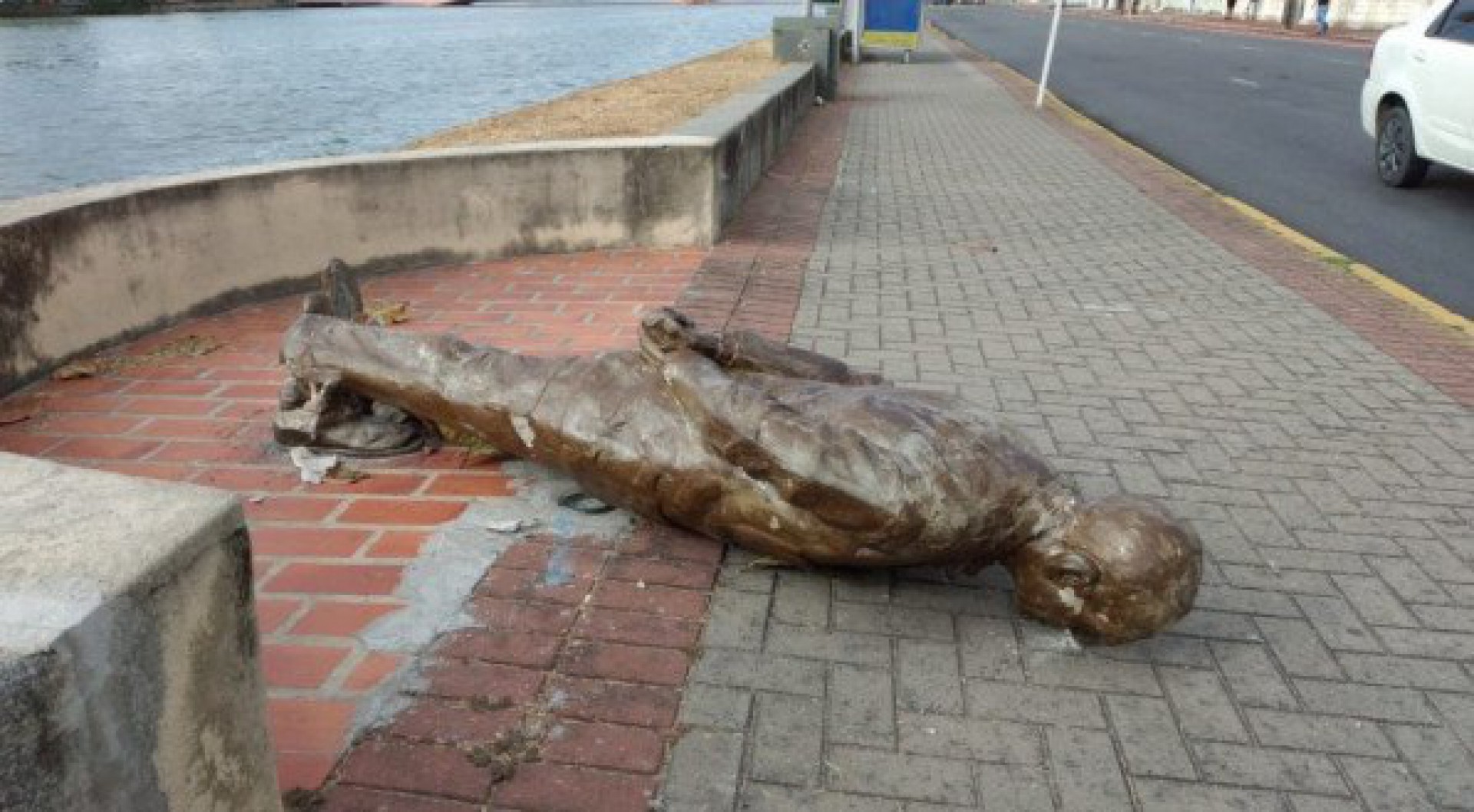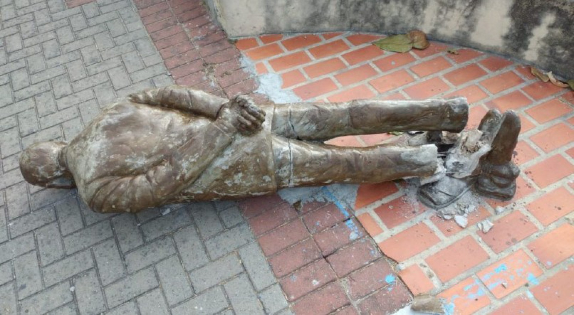 A escultura do escritor Ariano Suassuna, que fica na Rua da Aurora, no Centro do Recife, foi alvo de vandalismo na madrugada desta segunda-feira, 21. A obra, que mede 1,80, é assinada pelo artista plástico Demétrio Albuquerque e integra o Circuito da Poesia da capital pernambucana desde 2017. Quem passa pelo local pode observar que a estátua foi derrubada e se encontra com os pés e as pernas quebrados.