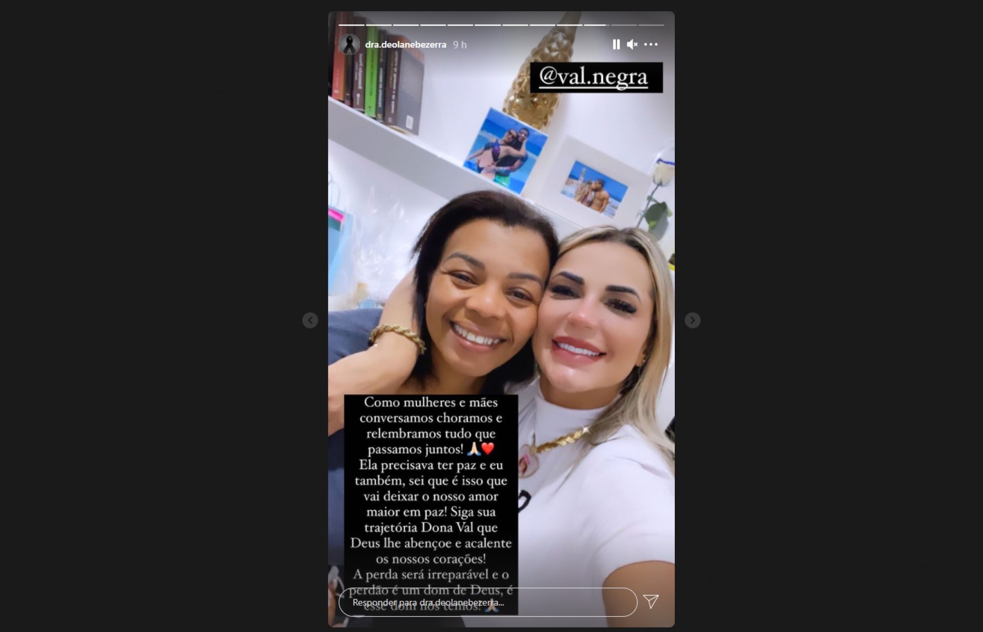 "Sei que é isso, que vai deixar nosso amor maior em paz. Siga sua trajetória, Dona Val, que Deus lhe abençoe e acalente nossos corações. A perda será irreparável e o perdão é um dom de Deus, e esse dom nós temos”, completou.