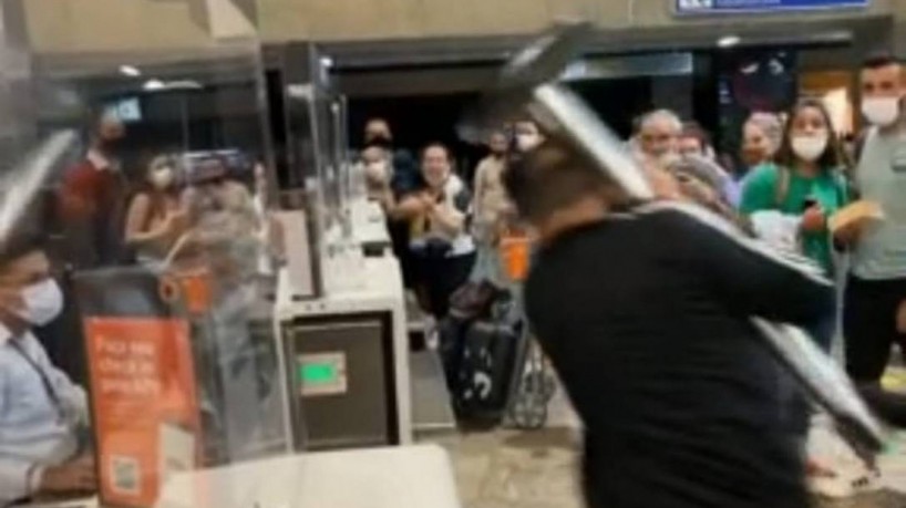 Irritado, o homem pega uma barra utilizada para organizar filas e começa a destruir o vidro do balcão da companhia.