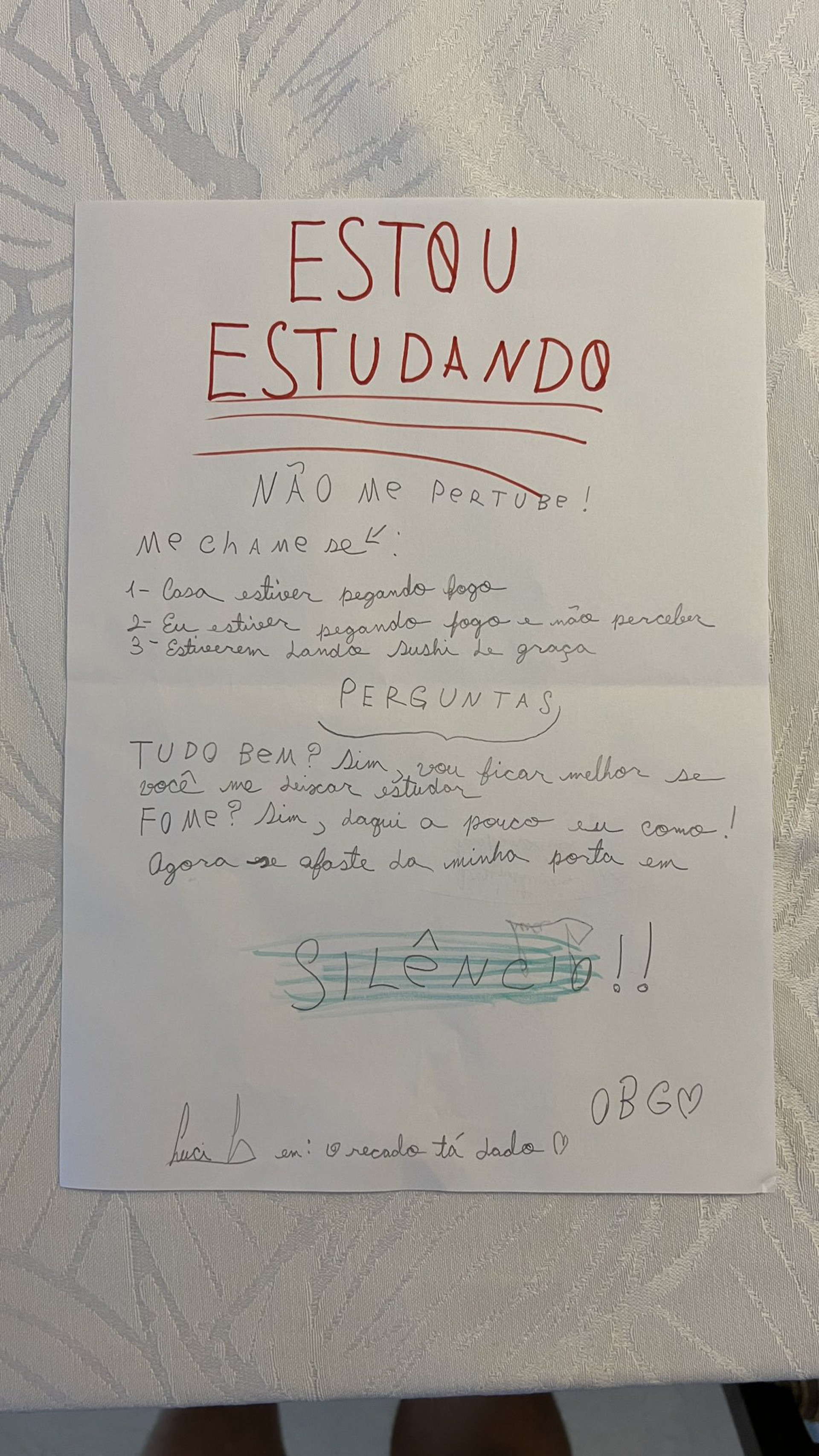 O papel anuncia que Luci estava estudando. E, para conseguir focar na atividade, o aviso pedia que não fosse incomodada, a não ser em circunstâncias específicas e inusitadas. São elas: a casa pegando fogo, ela própria estiver pegando fogo e não tiver ciência disso ou se, por algum motivo, "estiverem dando sushi de graça". Além disso, a criança pedia por silêncio e respondia possíveis perguntas que poderiam ser feitas por familiares, como se ela estava bem e se estava com fome.