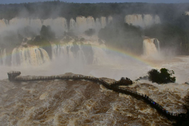 A reabertura ocorreu às 10h, depois de uma vistoria da equipe técnica do Parque Nacional do Iguaçu. Hoje, o volume baixou para 10 milhões de litros por segundo, ainda assim um volume quase sete vezes maior que a média.Passarela das Cataratas, que dá acesso ao Mirante da Garganta do Diabo, reaberta. - Divulgação/Edi Emerson/Parque Nacional do Iguaçu