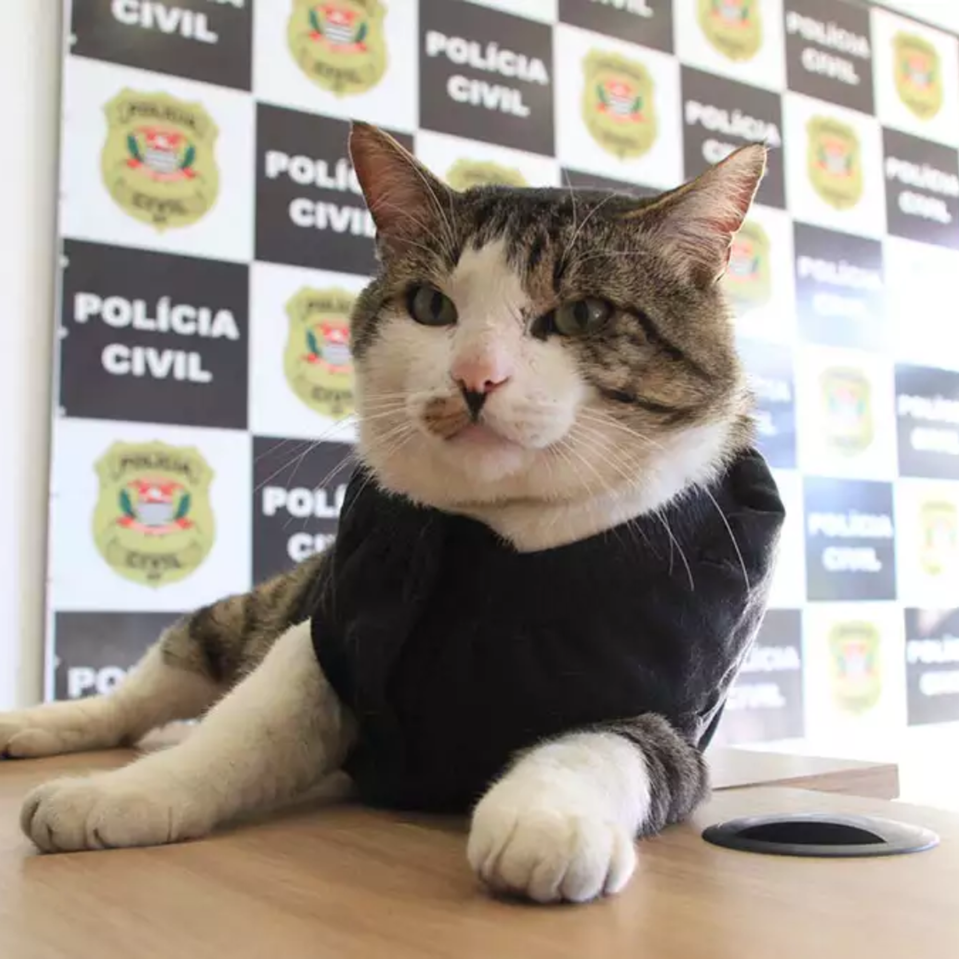 O felino foi adotado pelos policiais no final de março, quando recebeu cuidados após chegar à delegacia machucado e com fome. Rapidamente o gato ganhou o carinho dos policiais e ficou pela delegacia.