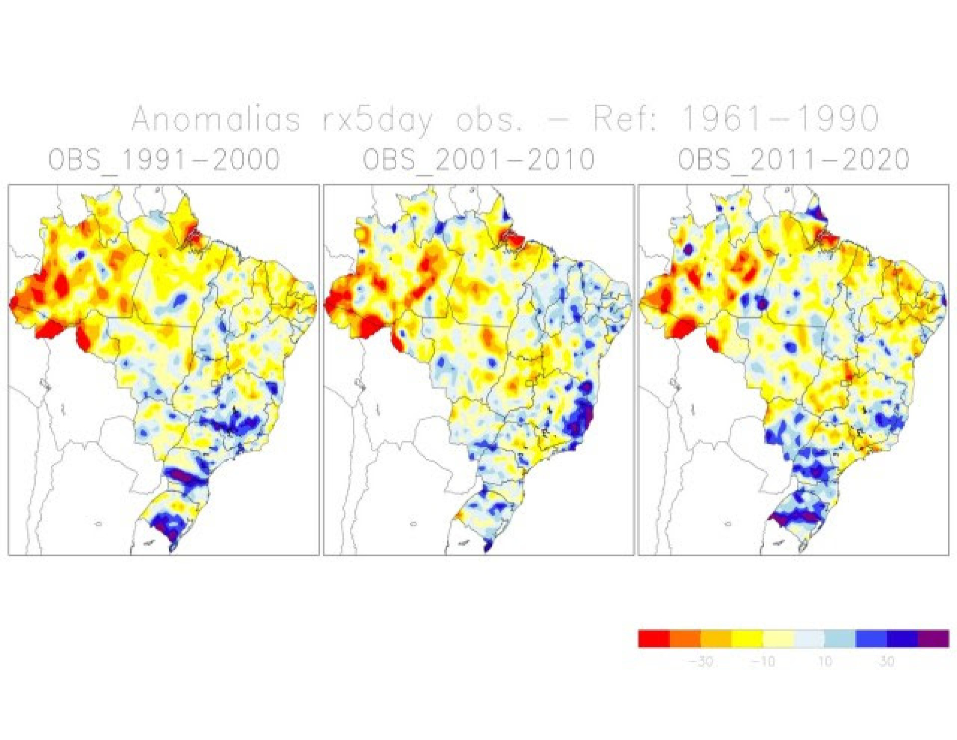 A redução de precipitação, especialmente no Nordeste e no Brasil Central, foi de 40%. Por outro lado, houve um aumento das chuvas na região Sul de até 30%. No período de referência, a precipitação máxima em cinco dias na região era, em média, de cerca de 140 mm. Esse valor cresceu para uma média de 160 mm.