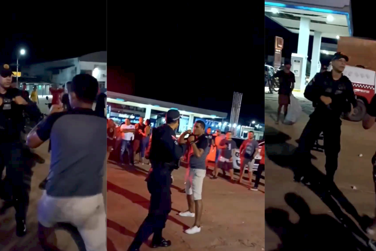 Em vídeo que circula nas redes sociais, é possível ver o momento em que o suspeito e dois policiais brigam enquanto outras pessoas assistiam à luta. Mais três agentes chegaram ao loca, e o suspeit foi mobilizado.