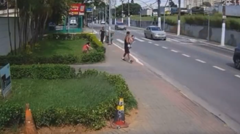 A mulher tenta se levantar, mas o suspeito dá um chute nas costas dela. A babá fica caída e o homem pega a criança.