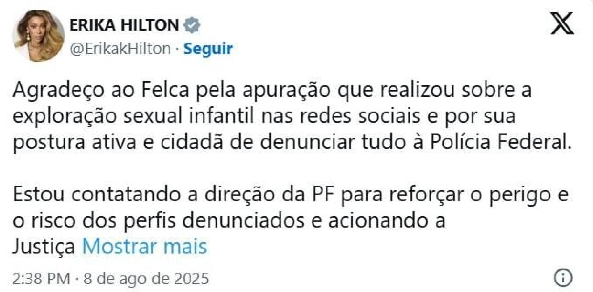 No último dia 8, Felca viralizou novamente ao denunciar a exploração da imagem de crianças e adolescentes por influenciadores digitais. Ao final do vídeo, ele anunciou ter aberto processos contra 233 perfis no X por difamação relacionada ao tema.