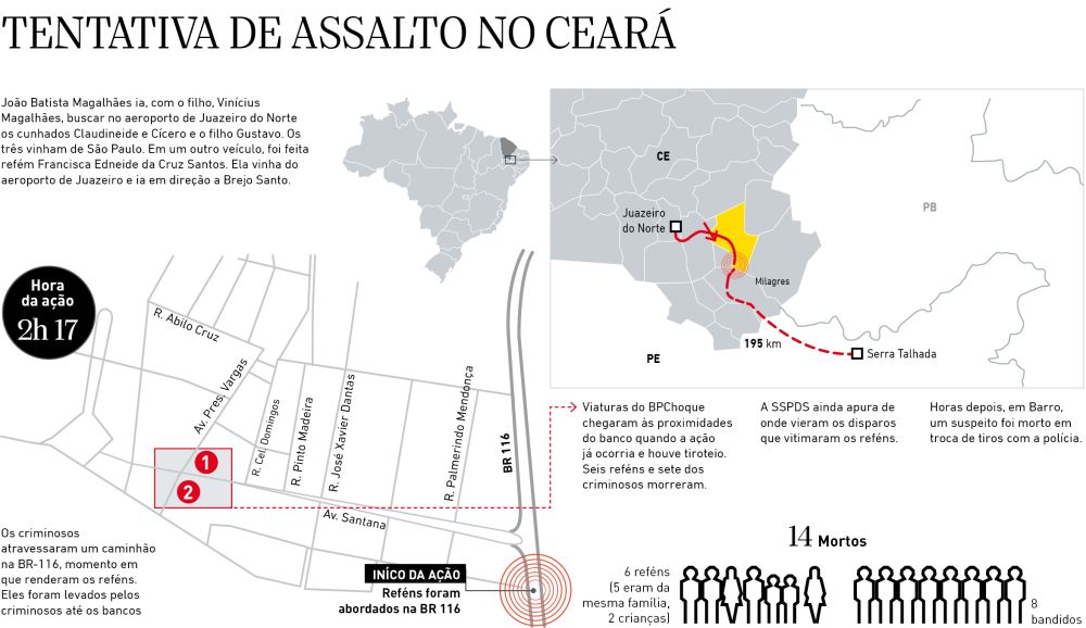 AssinePelo menos 14 pessoas morreram na madrugada de terror registrada nesta sexta-feira, 7 de dezembro (07/12), na cidade Milagres, situada a 482,7 quilômetros de Fortaleza. Dos mortos, pelo menos oito seriam responsáveis por articular ataques a bancos no Município. A ideia da quadrilha era roubar duas agências bancárias da cidade. Contudo, agentes da Secretaria da Segurança Pública e Defesa Social (SSPDS) foram informados da ação e tentaram contê-la. Em fuga, o bando ainda fez uma família refém. Na troca de tiros, vítimas foram mortas. Três homens estão presos, além de armas e carros terem sido apreendidos.
