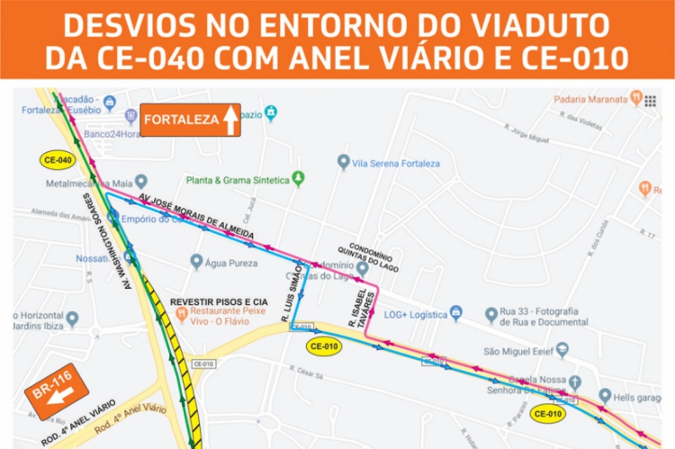 O entroncamento da rodovia do Anel Viário com a CE-040 (avenida Washington Soares) receberá um desvio temporário a partir deste sábado, 31. A mudança será realizada para a implantação de um viaduto no local, que deverá ser concluído até novembro, com as passagens por cima e por baixo completamente liberadas.