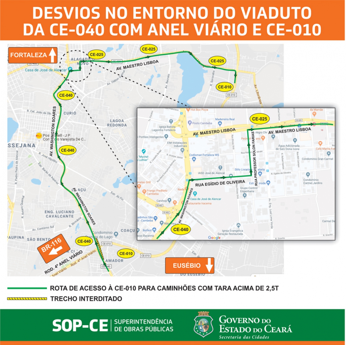 O percurso será realizado pela avenida José Morais de Almeida e Rua Luis Simão para os automóveis que pesarem até 2,5 toneladas. Caminhões com tara acima de 2,5 toneladas pegarão outro caminho, pela CE-025, av. Maestro Lisboa. Para os veículos de carga que vêm da BR-116, outra opção é seguir pela rodovia federal até a Raul Barbosa para acessar a Via Expressa.