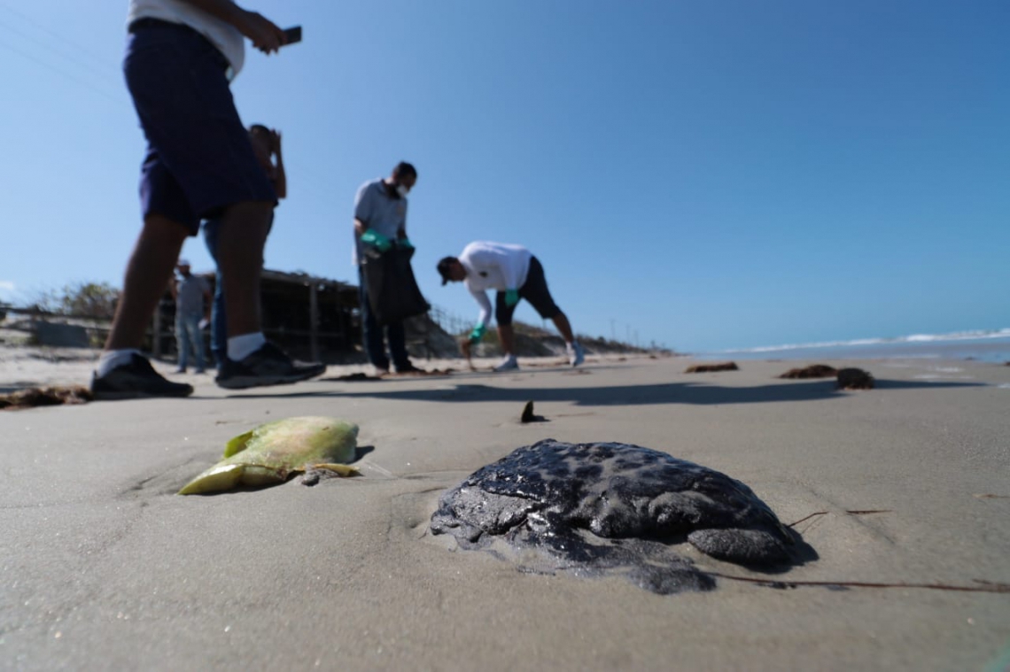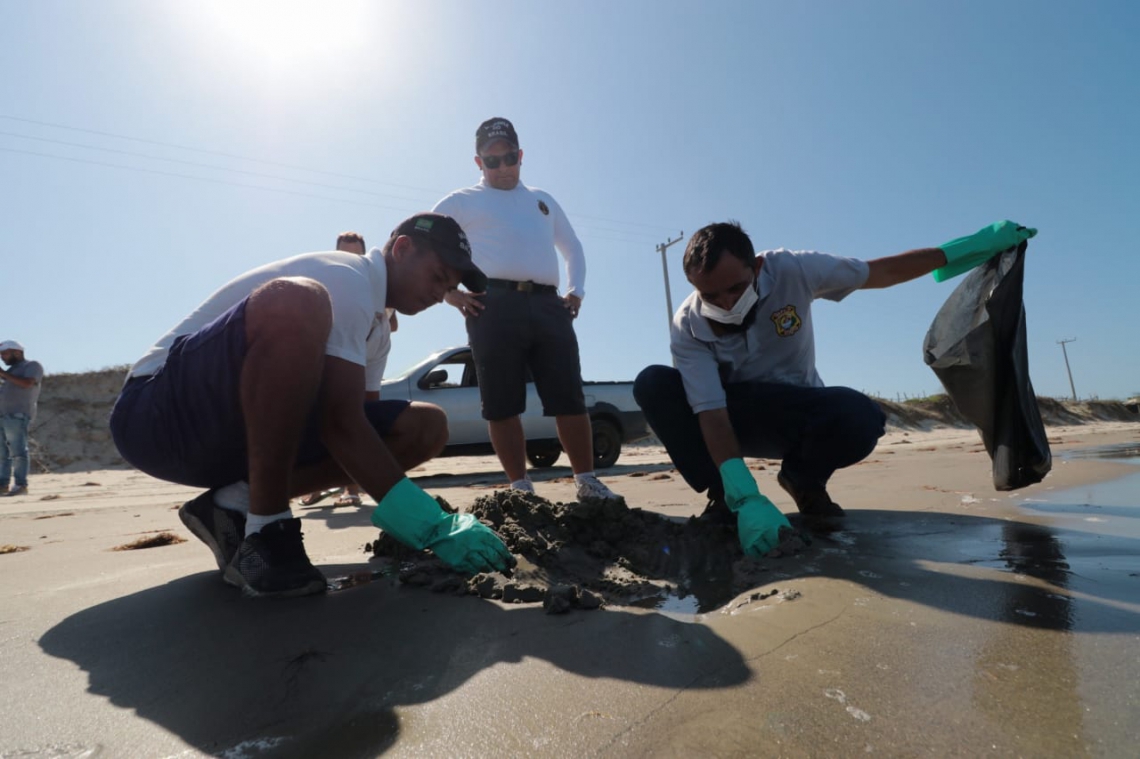 Em Aracati, 15 homens da marinha, o comitê do orgão ambiental do município, bugreiros e a comunidade estão trabalhando também na retirada de manchas de petróleo.