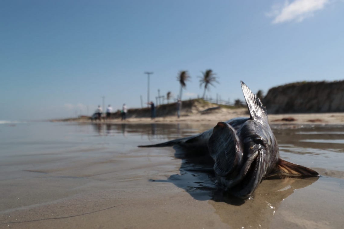 A Marinha e o Comitê de Emergência para a Limpeza das Praias encontraram nesta tarde mais manchas de óleo no litoral do Ceará, agora na praia Melancia de Baixo, em Icapuí. A equipe de reportagem do O POVO encontrou peixes mortos pela orla.